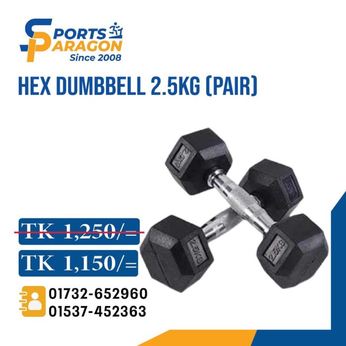 • 2.5kg hex dumbbells = 2 pcs. Made in China. Cromium plated hadle grip.Well furnished rubber coated.