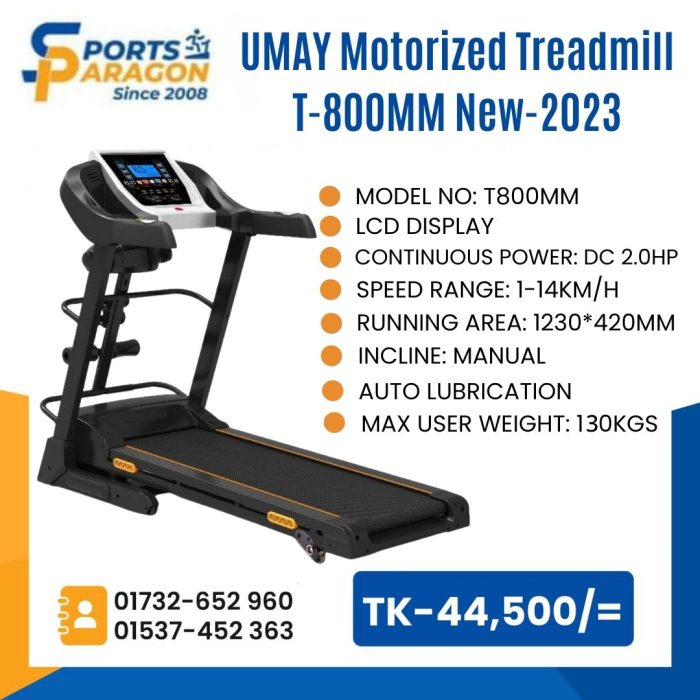 UMAY T800MM foldable Motorized Treadmill Brand: UMAY fitness Model NO.T800MM Motor: DC 2.0HP Screen: LCD, Console function- Speed, Distance, Calorie, Pluse, Time ,MP3 Running Size: 1230x420mm Speed: 1 -14km/H Incline: Manual -3/5% Max user weight: 120kgs N.W/G.W: 70kgs Safe guard system emergency stop key Extra Function: Body Massager, Sit-up, Dumbbell Set, Figure Twister. Folding: Foldable Manufacture country: China